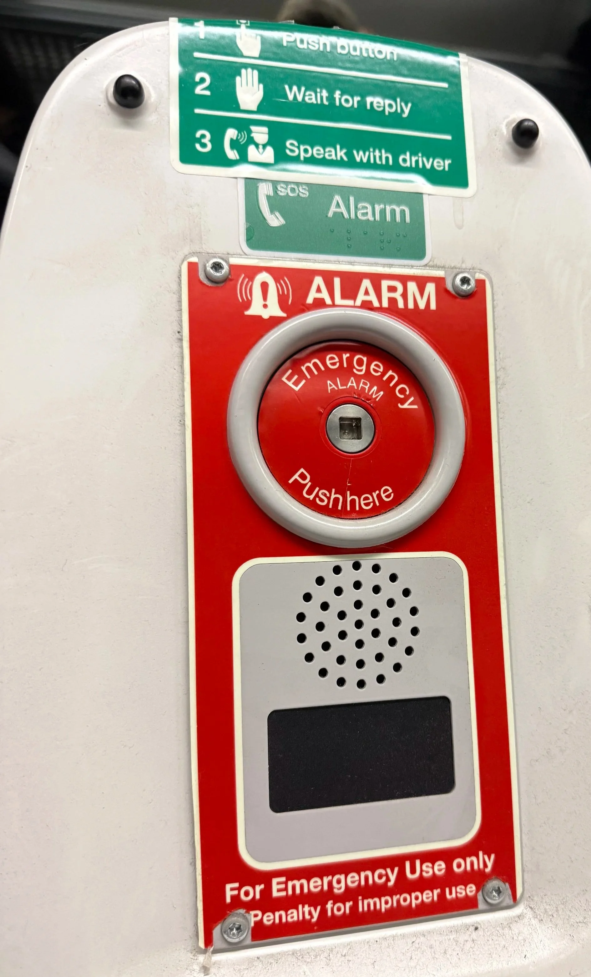 18:14: The train is moving. I wonder if the passenger assist team member remembered to call my home station and let them know that I am coming. If they don't, I will have to sit in the doors to keep them open and shout down to passengers on the platform until someone helps me. I really don't like doing that. It is embarrassing, and I'm worried that one day the sensors will fail and the doors will try to shut anyway. If no-one from the station comes to help, I have to ask the passenger nearest the alarm to push it. It's what we are supposed to do. It’s the only mode of contact we have with any form of assistance when on the train. Then the driver will come and sort it out, phoning the station, but they usually aren't best pleased. I just hope it doesn't end up terminating somewhere random. Once I'm on the train, I have no reliable contact with passenger assistance, so there's little I can do if that happens. I can't work, I'm too stressed, and this later service doesn't have wifi anyway. I might as well write.